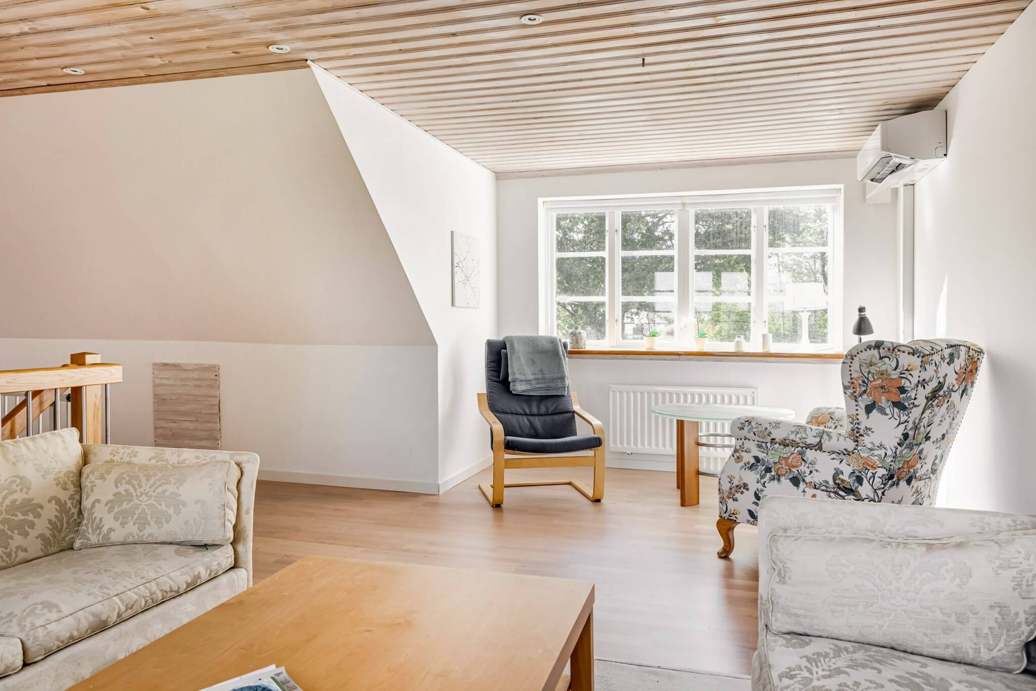 I vinkeln finns ett stort sovloft med plats för flertal sängar.