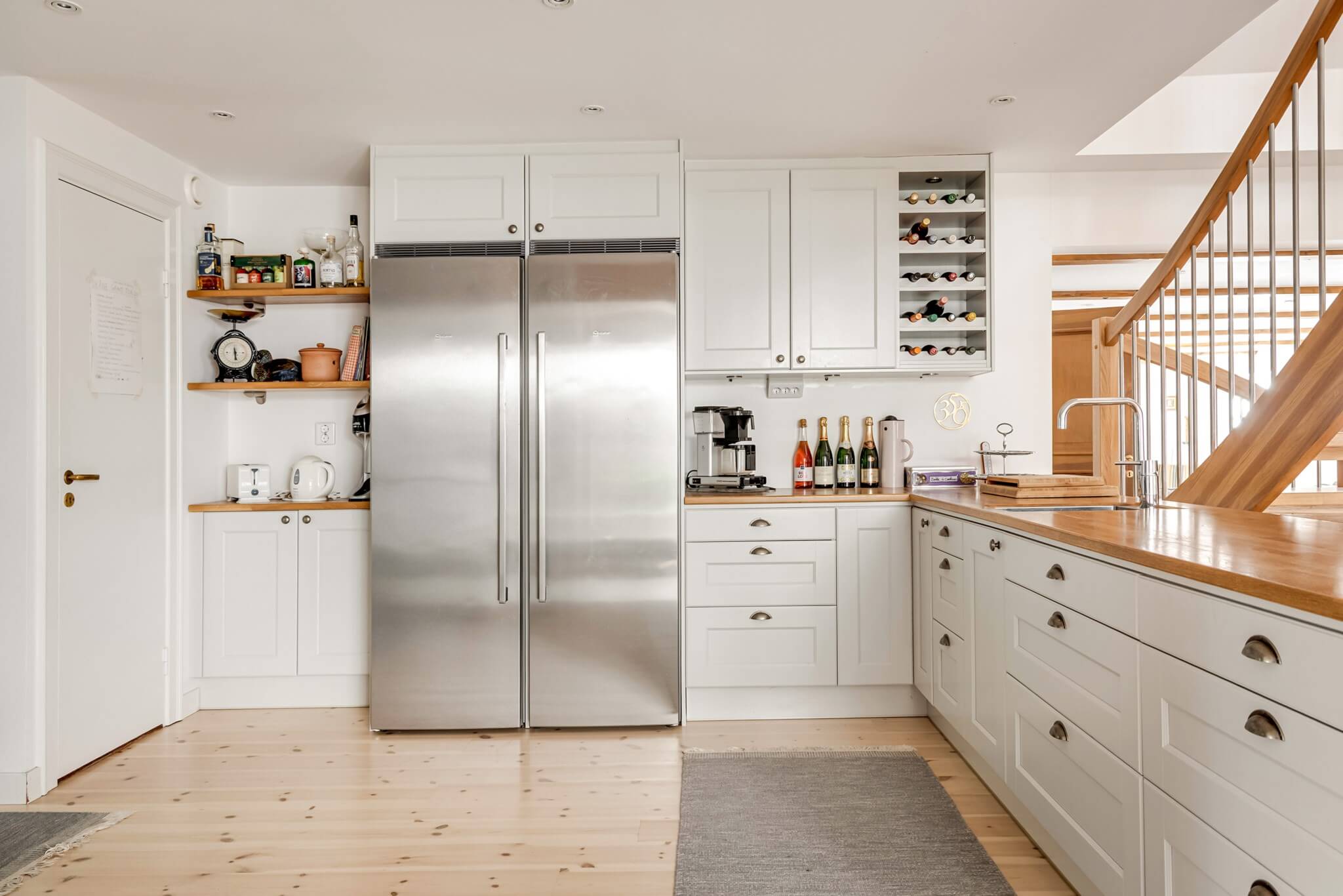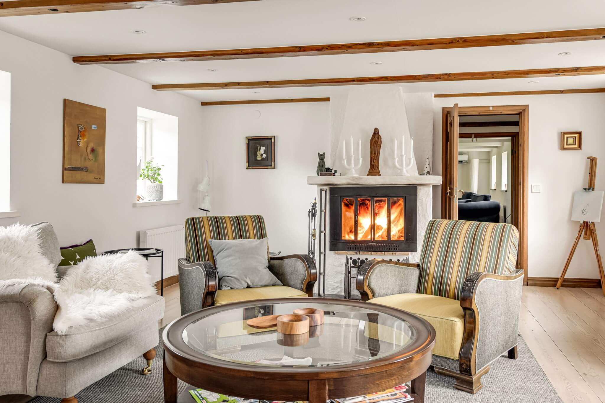 Matplats med öppen planlösning till köket. Stort vardagsrum med öppen spis. Mellan kök och vardagsrum finns ytterligare ett litet sovrum samt den fina Vitaby trappan upp till ovanvåningen. På högra sidan finns ett större sovrum samt ett helkaklat badrum med wc, bidé och dusch, i anslutning till badrummet finns ett rymligt förråd.