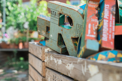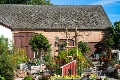 Kullerstenen på innergården skymtas under alla olika krukor med växter. Här finner vi en härlig blandning av rosor, mynta av alla de slag, olivträd, trädgårdsinredning och vackra blomsterarrangemang. Färgexplosion och kreativitet möter rustika tegelväggar och ojämna ytor. Den vackra entrén in mot trädgården består av smidesgrindar i kolonial stil från Indien och den har fått namnet Fikonporten.