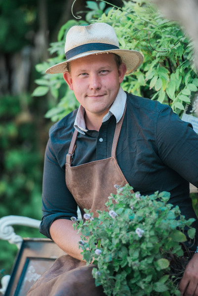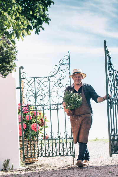 Karl Fredrik är florist och har en gedigen bakgrund inom yrket. Just nu har han uppehåll från sina studier till landskapsarkitekt och satsar helhjärtat på att utveckla verksamheten. Planerna och skisserna för nästa säsong är långt framskridna. Ännu en innergård ska anläggas, med bl.a. en vacker voliere från Frankrike. Där kommer besökarna att få uppleva odlingen i köksträdgården och djurlivet bestående av bl.a. pärlhöns och kaniner.