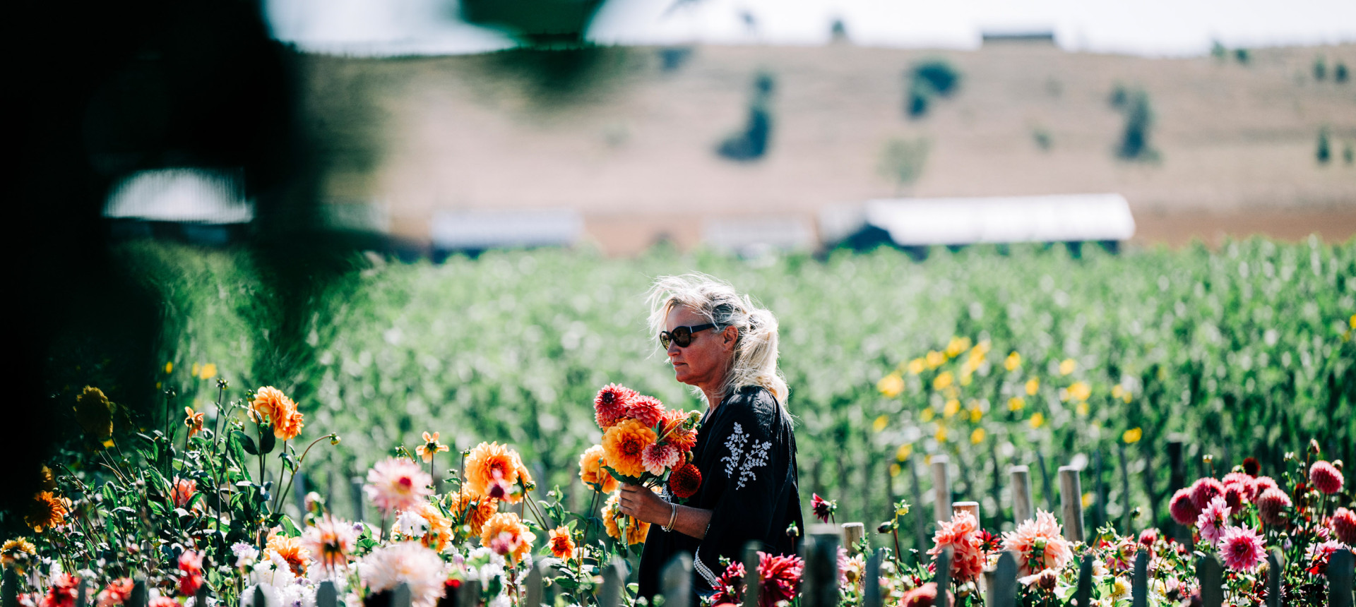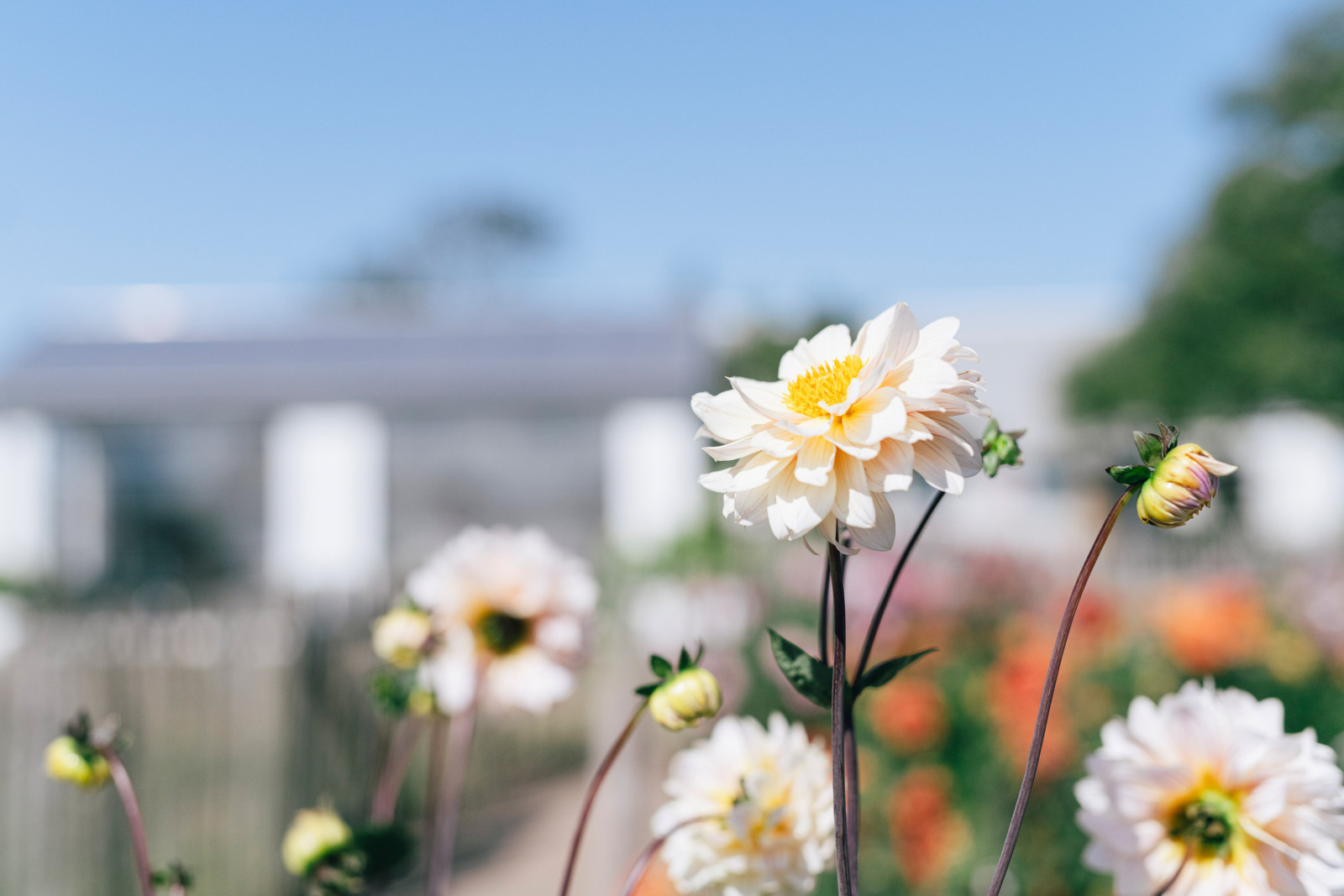 I bakgrunden bildar Kåsebergaåsen en böljande fond åt de över 300 dahliasorter som står här sida vid sida. Blommorna bär fantasifulla namn som Night Silence, Honka Fragile och Yellow Jill, och även om de alla är dahlior skiljer de sig åt i färg och form.
