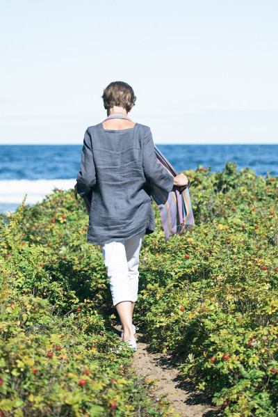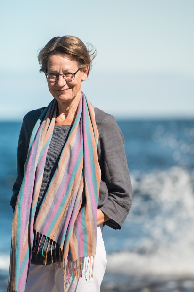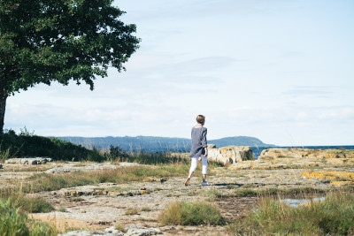Det är lätt att komma att tänka på det, när hon visar sin favoritplats: en liten undanskymd sandstrand utanför Baskemölla, inklämd mellan klipphällar, skog och låga nyponbuskar. Här ställer hon sig längst ut där höstvågorna skummar vilt och stänker våta kaskader över stenblocken.