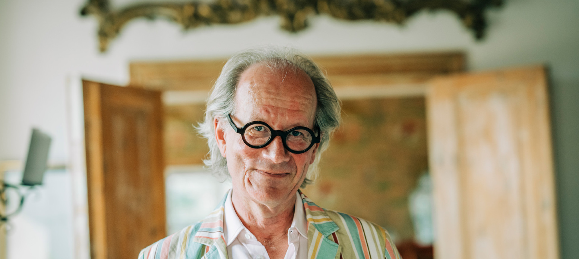 För dagen är han klädd i en randig kavaj där gult, rosa och turkos blandas i ljusa nyanser, accentuerade av hans gröna byxor och mörkgröna sammetstofflor. Han vilar tryggt i sig själv och tycks sakna den där ängsligheten som så många andra släpar runt på.