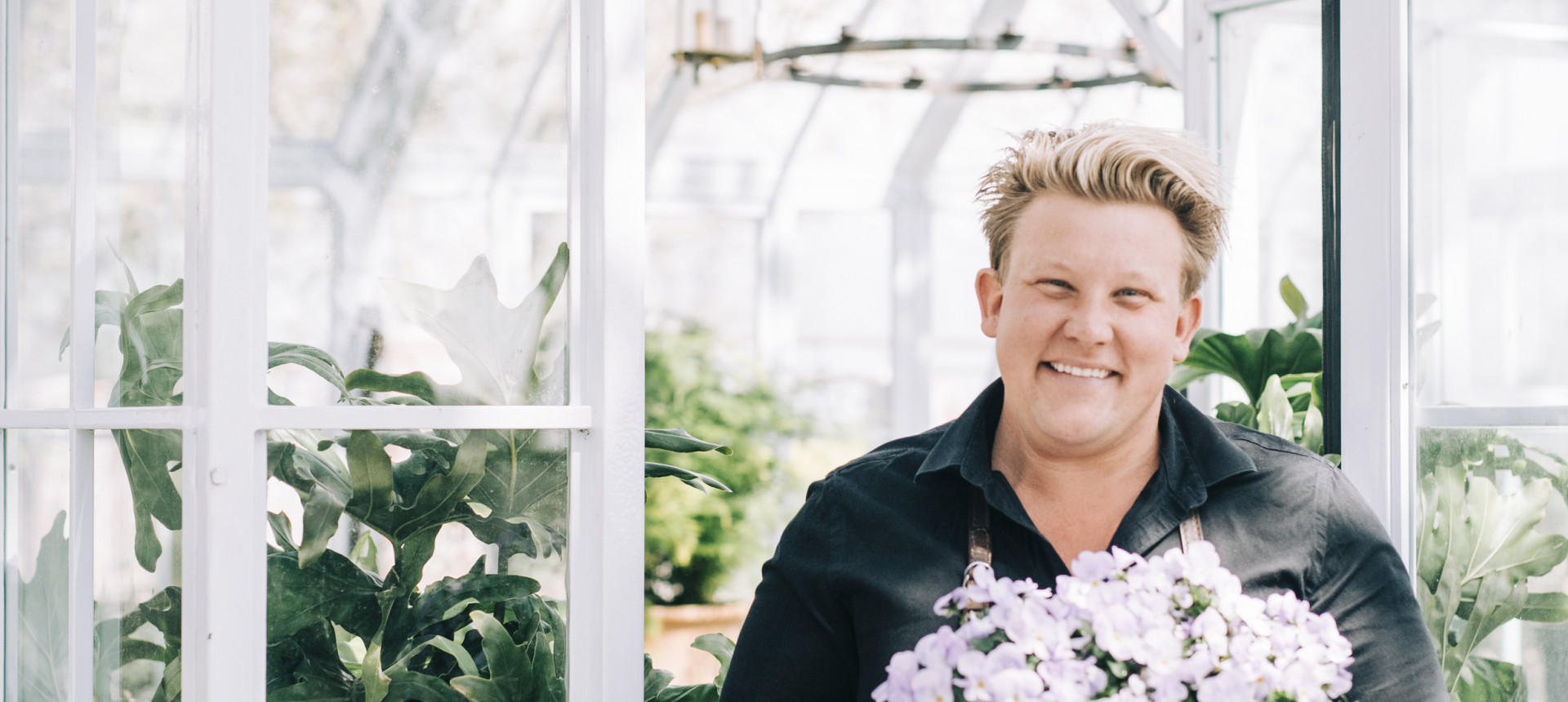 Smygfotograferar ni? Karl Fredrik Gustafsson snurrar runt 180 grader för att med ett vänligt leende vända sig mot de tre damer som står ett par meter bakom honom vid kaffevagnen på den kullerstensbelagda innergården. Han låter också förstå att han har noterat att ytterligare en kvinna vid ett kafébord i andra änden av gården har halat upp mobilkameran. – Jag uppskattar om man frågar, fortsätter han, hela tiden med ett leende på läpparna, och ställer sig sedan i en uppenbart invand fotopose.Rutinerat behåller han lugnet, trots att många blickar dras till honom och människor flockas i hans närhet. Han lyckas också tillrättavisa utan att för ett ögonblick bli otrevlig. Med glimten i ögat skapar han snabbt en hjärtlig stämning, när han börjar småprata med besökarna. Han brister ut i ett högt skratt, när damgänget ber honom säga ”kamelskit” i stället för ”omelett” och tillägger sedan snabbt: ”Fluff, fluff, fluff”, hans numera välkända catch-phrase. Den ena kvinnan hälsar från sin kusin Barbro i Mölndal, varpå Karl Fredrik utbrister: – Åh, vad trevligt! Barbro i Mölndal är underbar! Känner jag henne?Det är en vanlig dag på Eklaholm på Österlen. Högsäsongen har ännu inte kommit i gång på allvar, men parkeringen är nästan full och ett myller av människor vandrar runt i butiken. Bokningssystemet som infördes akut under den hektiska sommaren 2020 är tillbaka i år. Inte förrän i september är det möjligt att komma till Eklaholm utan att först avisera sitt besök. Karl Fredrik är inte längre bara en person, utan ett rikskänt varumärke, som pryder allt från vinflaskor till event. Omkring en halv miljon tittare har under våren bänkat sig varje vecka framför TV4 för att följa den andra säsongen av ”Karl Fredrik på Österlen”. Både Karl Fredrik själv och hans sambo Petter Kjellén är välbekanta ansikten även bland dem som inte har sett programmet. – Vi tycker att det är jättekul och härligt. Alla menar ju väl och vi får mycket kärlek. Det är en framgångssaga. Många har blivit inspirerade efter att ha sett programmet. Men visst blir det lite slitigt emellanåt också, säger Karl Fredrik, när han slår sig ner i orangeriet i den privata trädgården, och tillägger: – Jag har svårt för mellanlägena. Men det är nog också det som har skapat framgångarna, att vi gör saker fullt ut, både utifrån vad vi brinner för och genom att vara mycket tillgängliga. Trädgården ligger bara runt knuten från myllret i de publika delarna. Ändå infinner sig en behaglig stillhet och tystnad, som om allt det där som pågår bara några meter bort knappt existerar. Orangeriet skuggas av ett storslaget bigarråträd, som just denna dag står i full blom, med enskilda solstrålar som tränger ner genom lövverket. Det är faktiskt bara fem år sedan som butiken Karl Fredrik på Eklaholm startades. Den då knappt 30-årige grundaren vann snabbt lokalbefolkningens hjärtan med sin sprudlande personlighet och var redan då en erfaren florist, trädgårdsmästare och butiksinnehavare. Som 18-åring blev han delägare i en handelsträdgård utanför uppväxtorten Örebro. Så här i efterhand konstaterar han att den nog var lite före sin tid. – Vi låg ute på landet, hade specialväxter och vågade också ta bra betalt för vissa saker. Jag hade ungefär samma smak och stil som i dag, men det är ändå 17 år sedan och det är ganska stor skillnad på nu och då. Trädgårdssverige och hela tänket kring inredning har ändrats mycket. Jag drog många lärdomar av den verksamheten.Den 18-årige Karl Fredrik köpte också en sommarstuga vid sjön Lången utanför Örebro för att få utlopp för sin odlingskreativitet. Stugan hade varken el, värme eller rinnande vatten. Där fanns en gårdspump, utedass, vedspis och en lucka i köksgolvet för kylvaror. – Jag kände att jag behövde ha tillgång till en trädgård. Mina föräldrar hade börjat tröttna på att jag experimenterade hemma hos dem. Jag såg det som en konstform, och det är klart att det kanske gick lite till överdrift, när jag började sätta dockhuvuden på pinnar och sådana saker. Karl Fredrik sålde så småningom sin del i handels-trädgården och fortsatte som anställd florist, anlitades som konsult på mässor och drev en egen firma. Han hann också med en vända till Oslo, där han jobbade i en butik med både hotellkungen Petter Stordalen och den verklige monarken bland kunderna. – Det var en spännande tid, som verkligen har påverkat mig. Teamet var bra och vi hade en hög arbetsmoral och stolthet över det vi presterade. Vi gjorde också lite annorlunda saker och jobbade mycket i naturmaterial, som på den tiden inte var så stort i Sverige. Som 22-åring blev Karl Fredrik headhuntad som butikschef för inredningsbutiken House of Örebro. Det gick så bra att han fick samma uppdrag för House of Västerås. I samma veva fick han sin morfars gård i gåva, eftersom han med sina talanger ansågs vara rätt man att ta hand om fastigheten. Trädgårdsintresset ligger i generna. Morfars mamma kunde alla växters namn på latin och frösådde mycket själv, morfar jobbade på SJ men var också månskensbonde och farmor och farfar var självförsörjande på grönsaker. Som liten hälsade Karl Fredrik ofta på sina farföräldrar och åt nyplockade sommarmorötter direkt ur grönsakslandet. – Farmor älskade astrar. På den tiden var det lite tantvarning på det, men nu är de blommorna ganska trendiga. För sju år sedan kom Karl Fredrik till Skåne för att läsa till landskapsarkitekt på SLU Alnarp. Även om han skulle komma att hoppa av utbildningen efter fem terminer ledde flytten till en livsavgörande händelse.I Malmö fann han mannen som han sedan dess har delat livet med och nu också har förlovat sig med. Den tredje lördagen i september 2014 gick de på sin första dejt. Mindre än ett år senare köpte d
